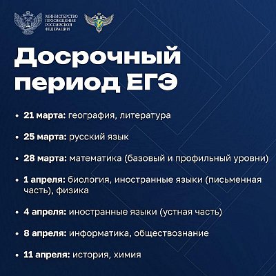 Во Владимирской области досрочный период начнется 21 марта с экзамена по географии и литературе. 25 марта состоится ЕГЭ по русскому языку, 28 марта по математике, а 1 апреля – по биологии, физике. В тот же день проведут письменный экзамен по иностранному языку. А устную часть можно будет сдать 4 апреля. 8 апреля отведено для экзамена по информатике и обществознанию, а 11 апреля – для истории и химии.