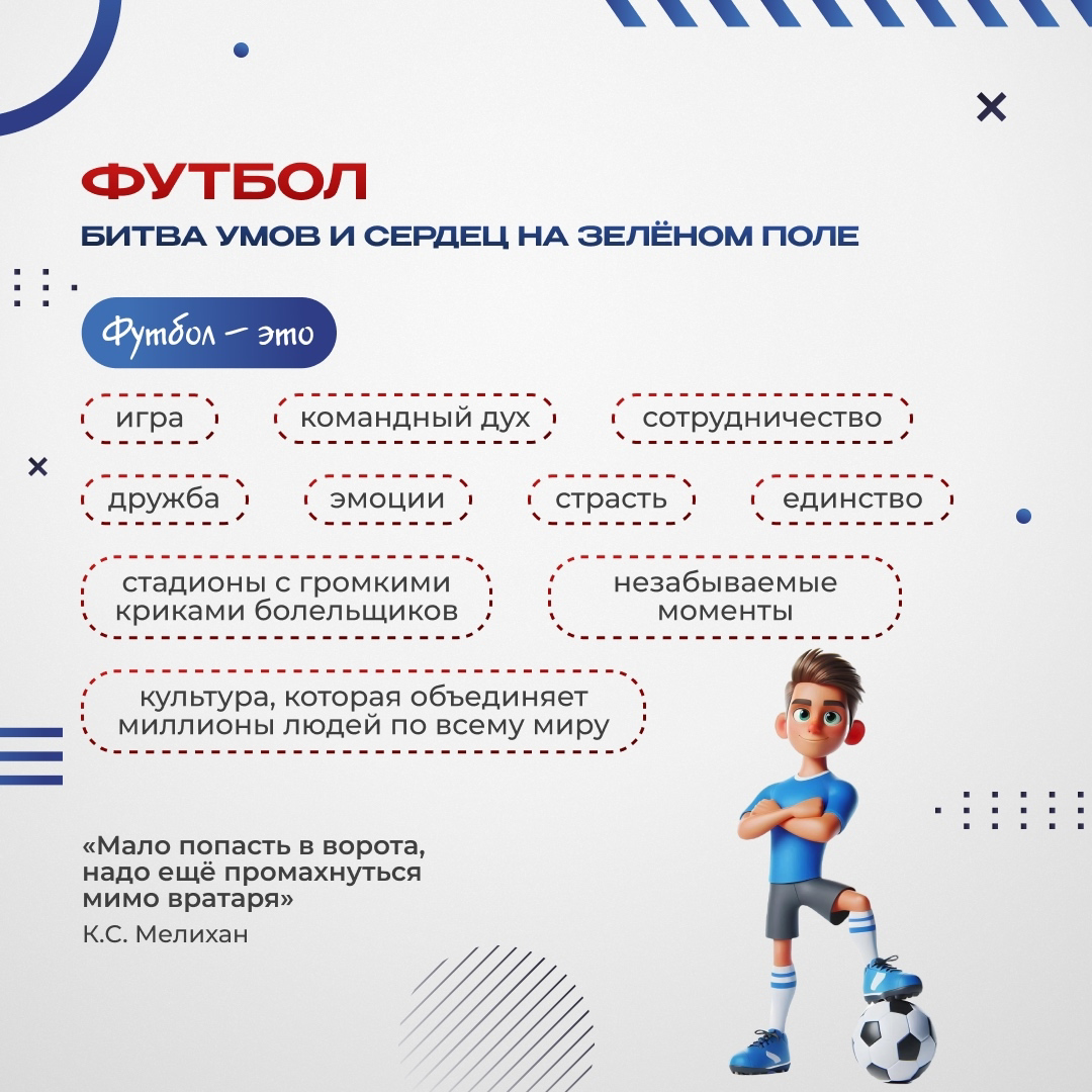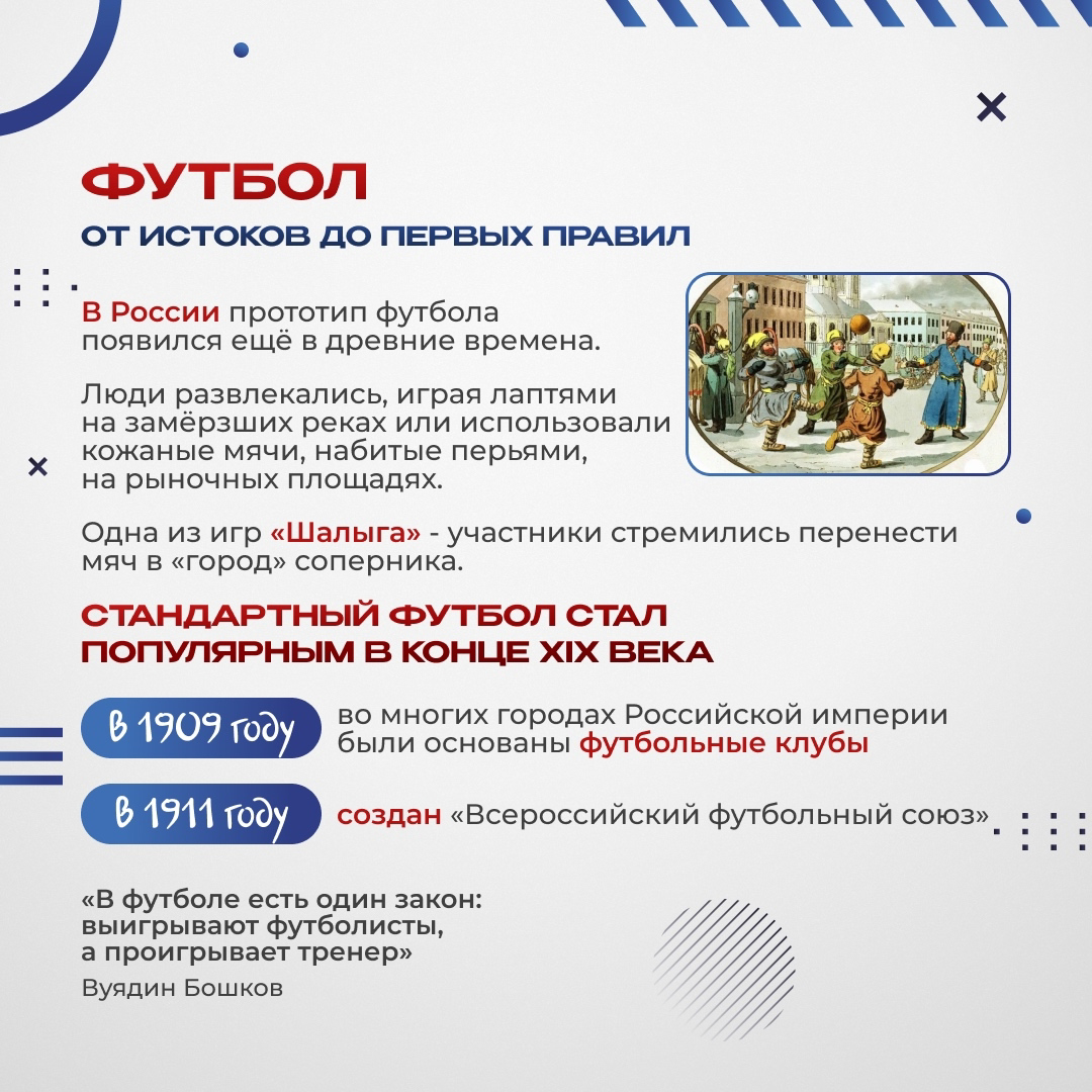 Чемпионаты России, матчи национальной сборной и клубные турниры - это важная часть спортивной жизни страны. Сегодня футбол является важной частью культурной жизни, укрепляя дружбу, взаимодействие и чувство общности среди людей. Им занимаются не только профессиональные спортсмены, но и любительские клубы и даже дворовые команды.
