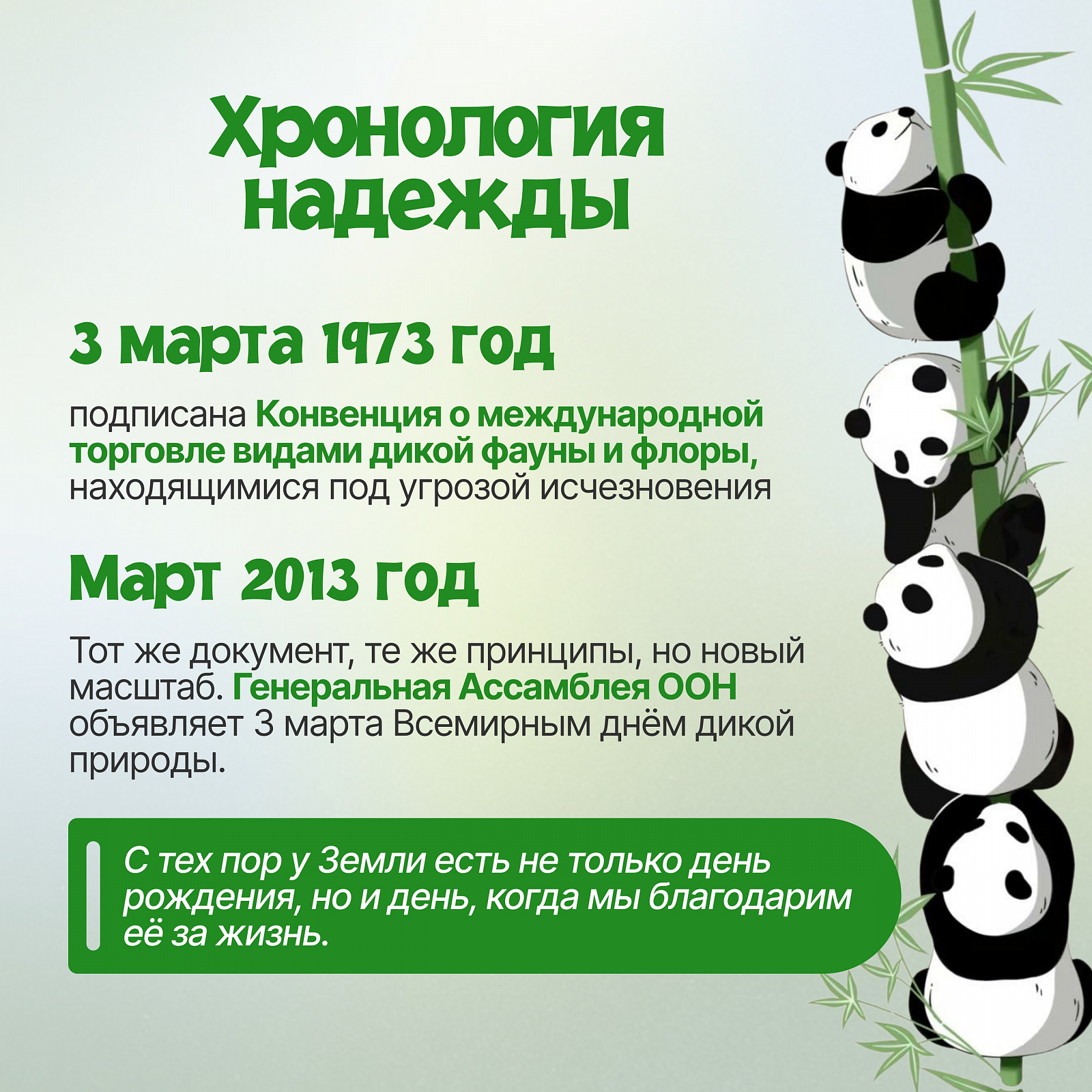 Люди во всем мире полагаются на дикую природу и ресурсы, основанные на биоразнообразии, для удовлетворения своих потребностей — от продуктов питания до топлива, лекарств, жилья и одежды. Для того чтобы мы могли наслаждаться благами и красотой, которые дарит нам природа и наша планета, люди работают вместе, чтобы экосистемы процветали, а виды растений и животных продолжили существовать для будущих поколений. Этот международный день позволяет нам задуматься о роли дикой природы и отметить важную работу по охране природы, которая ведется по всему миру.
